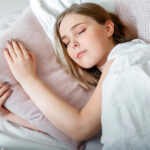 Teenager girl in pajamas sleeps in bedroom